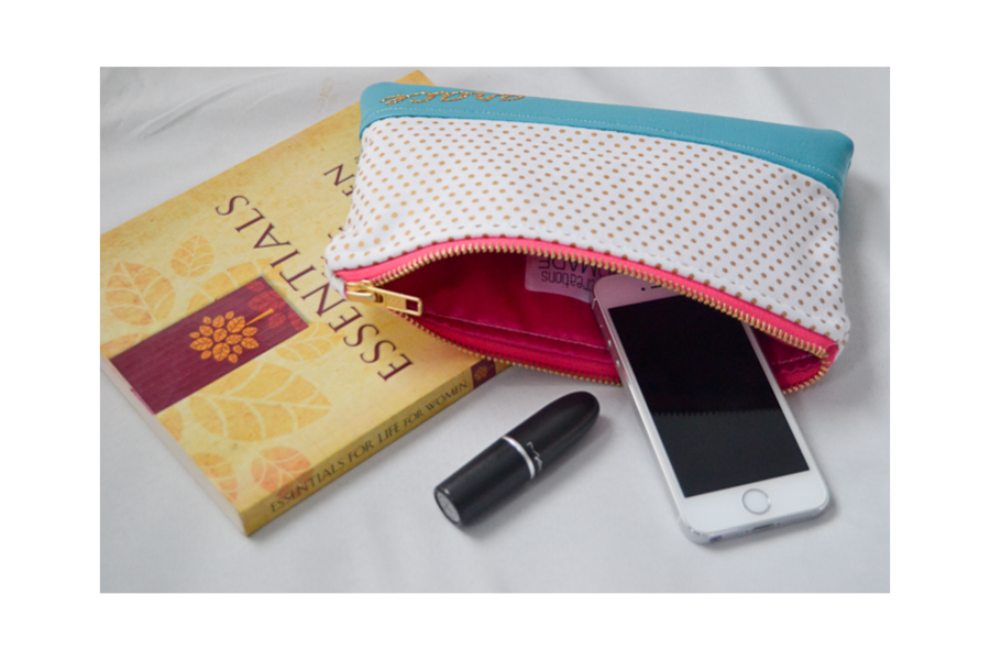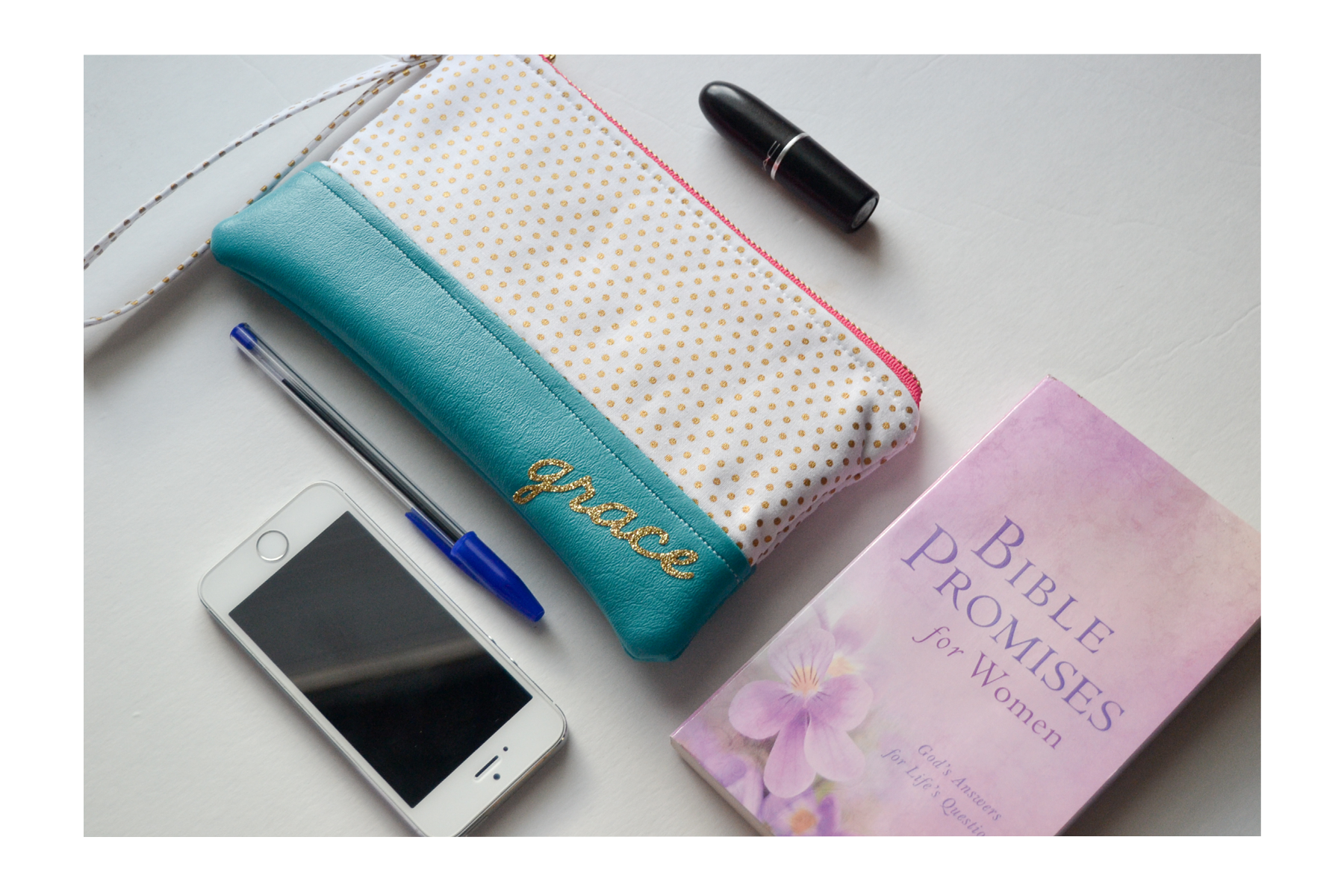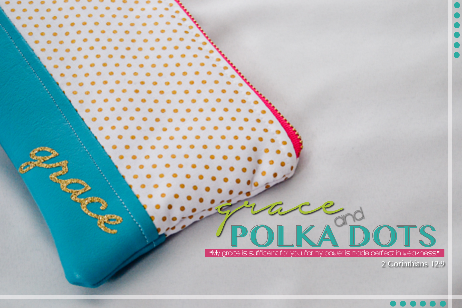 Bright faux leather meshed with gold polka dots...who can't resist this fun wristlet! Made specifically for your colorful and faithful spirit! The simplicity of the one word "grace" embellished wristlet reminds you that “[God's} grace is sufficient for you, for my power is made perfect in weakness” 2 Corinthians 12:9.