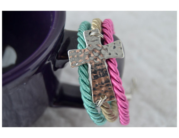 Trendy and unique way to express your faith with this sideway hammered cross bracelet. Made from three nicely coordinating silk ropes (twisted) and fits all sizes with adjustable clasp. These bracelets will make great gifts of encouragement for yourself/others or the perfect accessory for bridal parties, ministries, growth groups, etc.