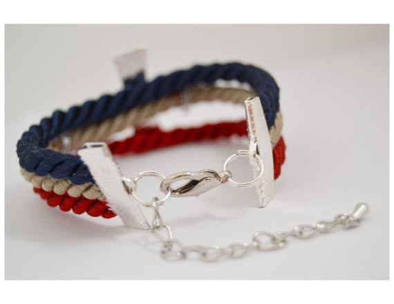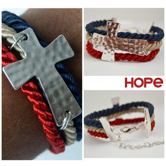 Trendy and unique way to express your faith with this sideway hammered cross bracelet. Made from three nicely coordinating silk ropes (twisted) and fits all sizes with adjustable clasp. These bracelets will make great gifts of encouragement for yourself/others or the perfect accessory for bridal parties, ministries, growth groups, etc.