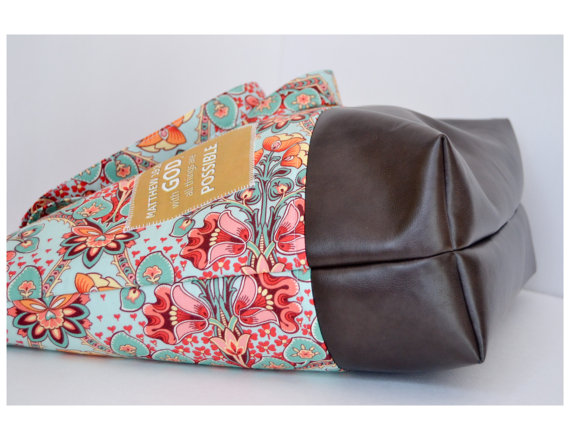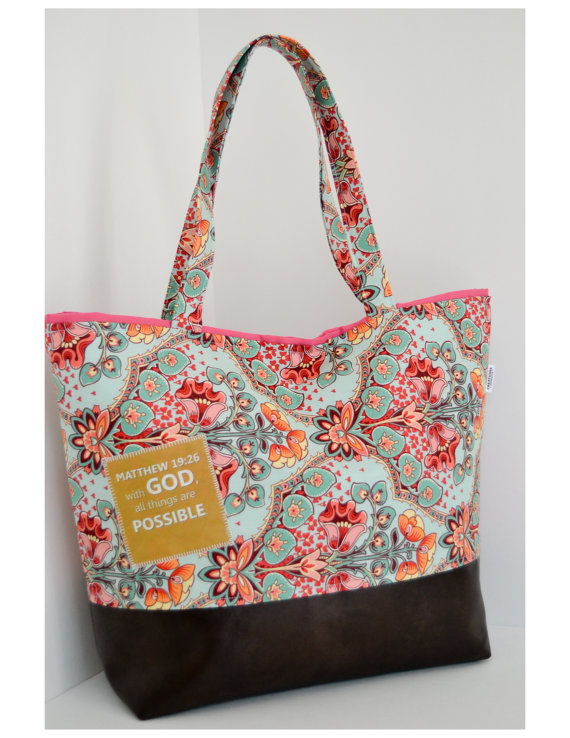 Express your faith with the versatile Sequoia tote bag! This tote/shoulder bag is designed with cotton fabric trimmed in dark brown faux leather for chic style and added durability. The perfect size for everyday use - work/school, diaper bag, market bag, bible study tote, and so much more! Tote bag will make a great gift of encouragement for yourself and others. Spread the great news about Christ while being fashionable.