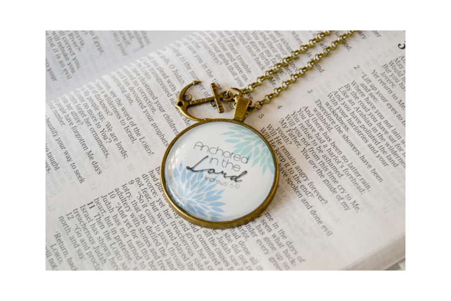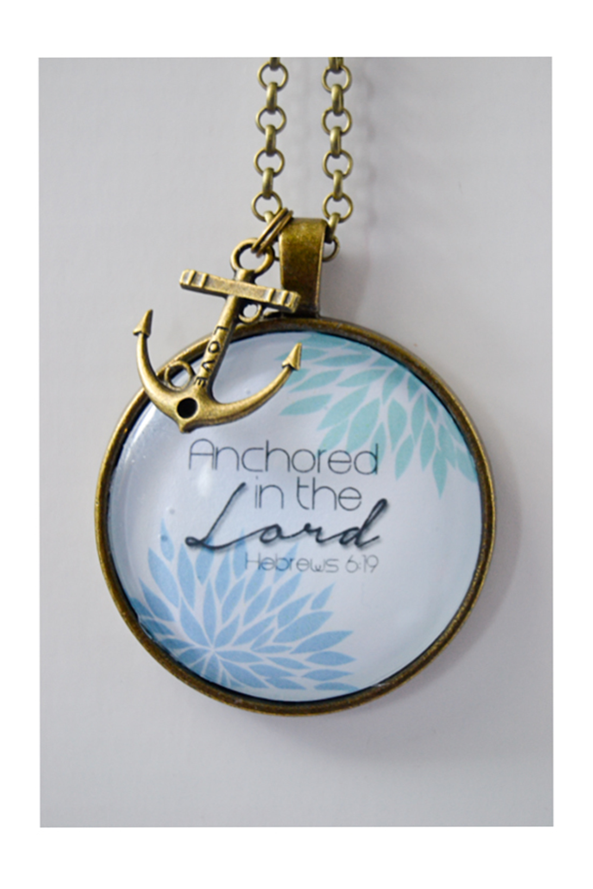 Are you Anchored in the Lord? Wear and share your faith with this lovely glass pendant necklace uniquely designed with Hebrews 6:19 scripture and adorned with a "love" anchor charm.
