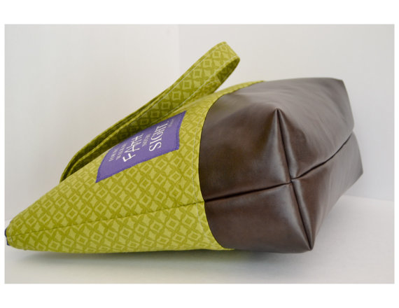 Recommend spot clean or handwash/lay flat to dry. Cotton/canvas portion of bag can be ironed to release wrinkles. Tote bag has been treated with Fabric Scotchguard to help repel stains.