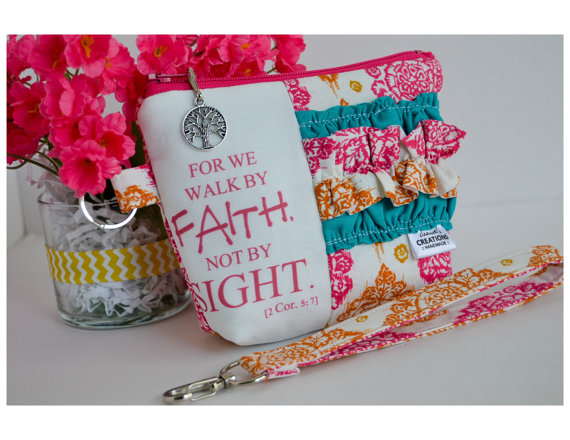 Stylish & functional small Sequoia wristlet or clutch to carry your everyday necessitates (iPhone/cellphone, cash, credit cards, lipstick, etc.) while expressing your faith! Great for on the go, cosmetics, or to organize your bag/purse. These unique wristlets will make great gifts of encouragement for yourself/others or the perfect accessory for bridal parties, ministries, growth groups, etc.