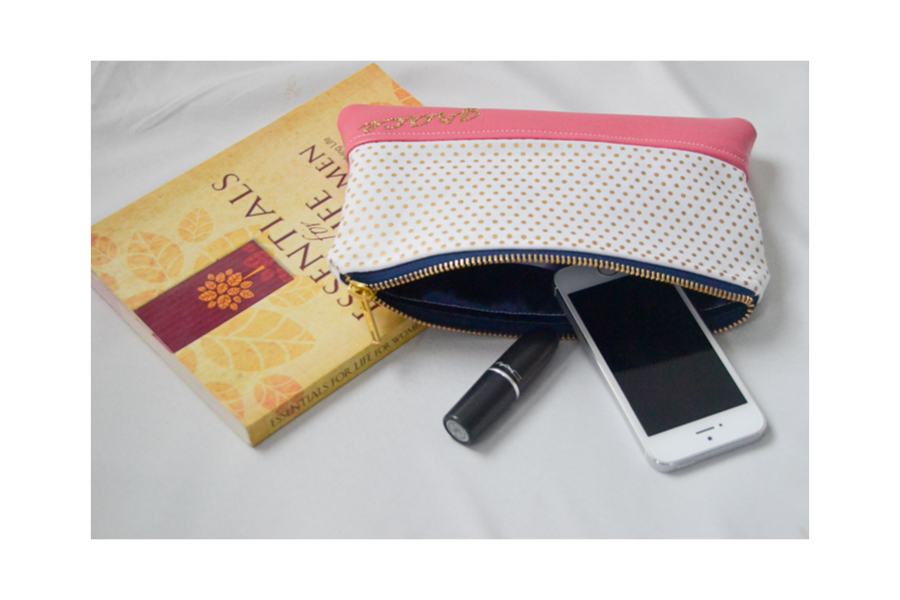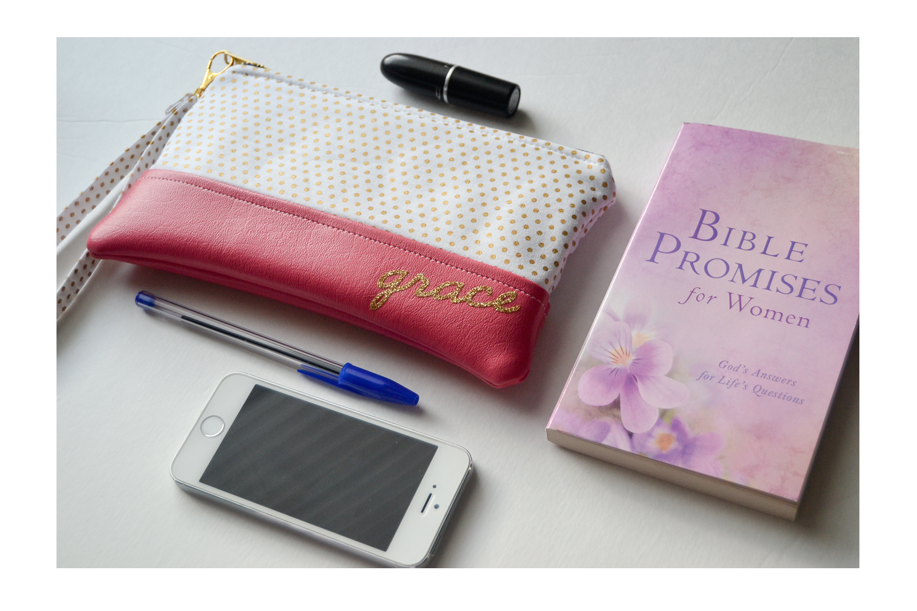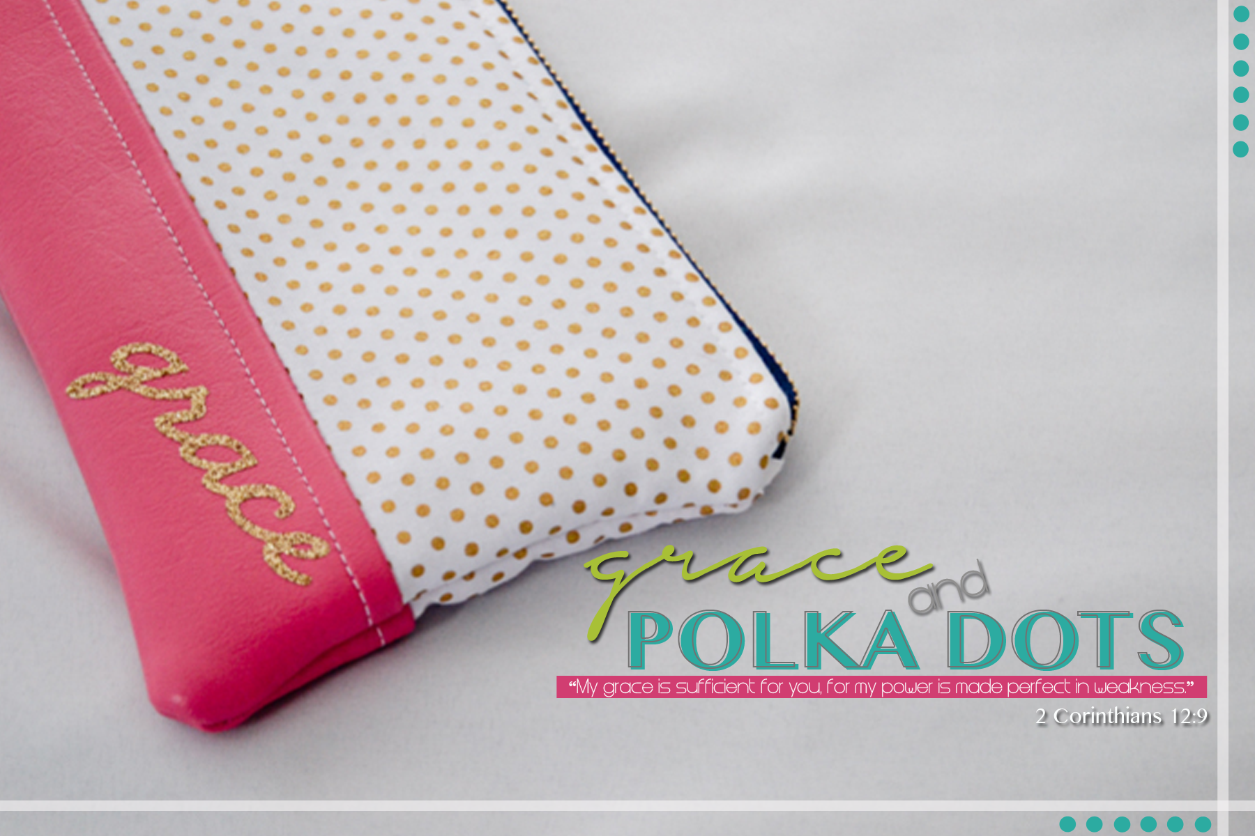 Bright faux leather meshed with gold polka dots...who can't resist this fun wristlet! Made specifically for your colorful and faithful spirit! The simplicity of the one word "grace" embellished wristlet reminds you that “[God's} grace is sufficient for you, for my power is made perfect in weakness” 2 Corinthians 12:9.