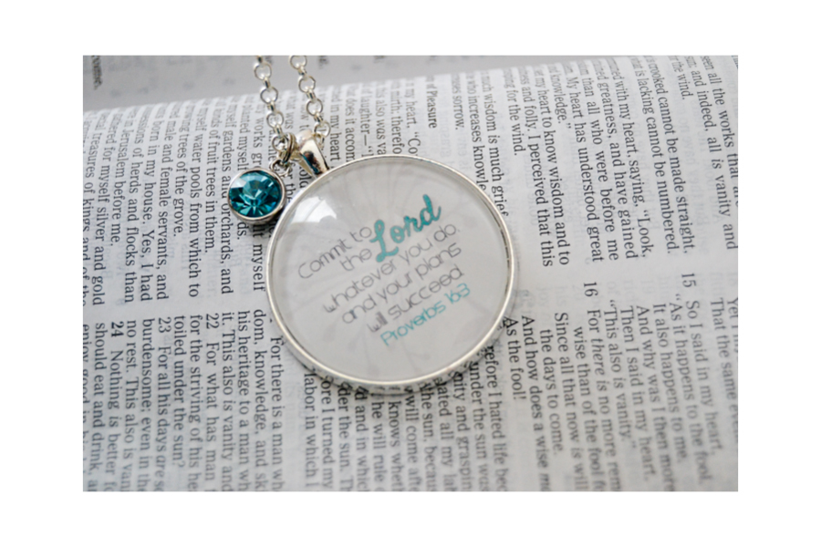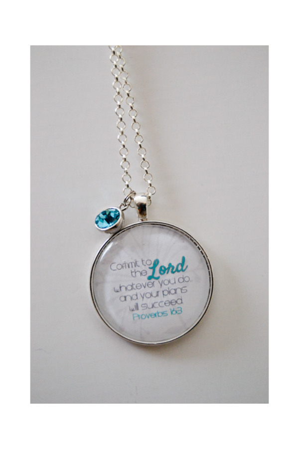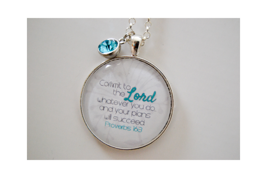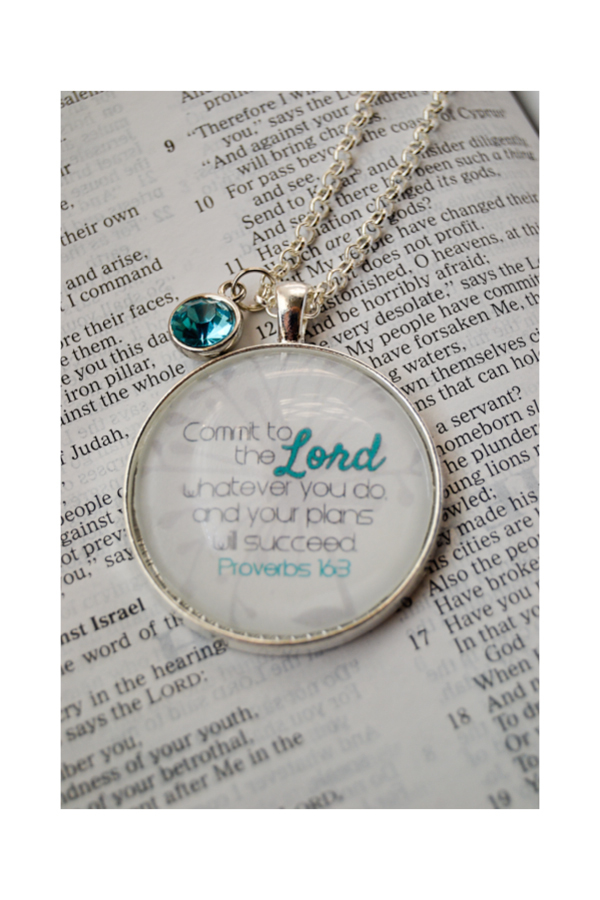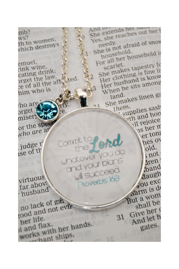 Be reminded that God is in control and has plans for you! Yep...you will SUCCEED! Wear and share your faith with this lovely glass pendant necklace uniquely designed with Proverbs 16:3 scripture and adorned with a turquoise crystal drop charm.